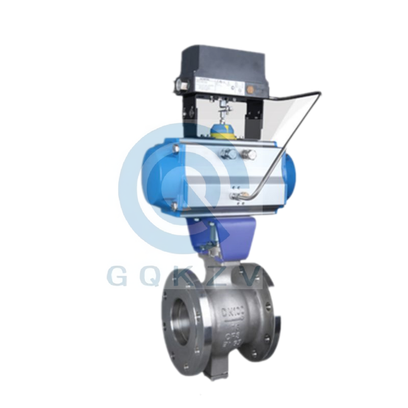 气动V型球阀是一种直角回转结构的高级控制阀,它与阀门定位器配套使用,可实现比例调节;与二位五通电磁阀及控制箱配套使用,可实现开关控制。气动V型球阀阀芯设计成带有特殊形状的V型缺口,具有精确的截流物性和控制功能,适用于各种控制场合,结构紧凑,体积小,可紧卧安装等优点。气动V型调节球阀适用于气体、液体、固态颗粒状介质的控制。由于阀芯和阀座之间是无间隙回转,所以具有很大的剪切力及自洁性能,尤其适用于含有纤维性或有微小固体颗粒的悬浊液及固态颗粒状的控制。因此气动V型球阀本产品可广泛用于石油、化工、造纸、化纤、电力、冶金、制药、环保等工业部门的自控系统。